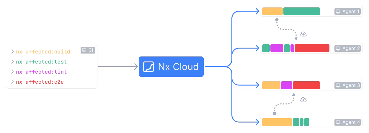 Distributed Task Execution with Nx Cloud solves this issue — it allows you to optimally parallelize tasks without thinking about their interdependencies or agent management. You don't have to use it immediately, but it's useful if you want to keep your CI times low even as your workspace grows. 🚀