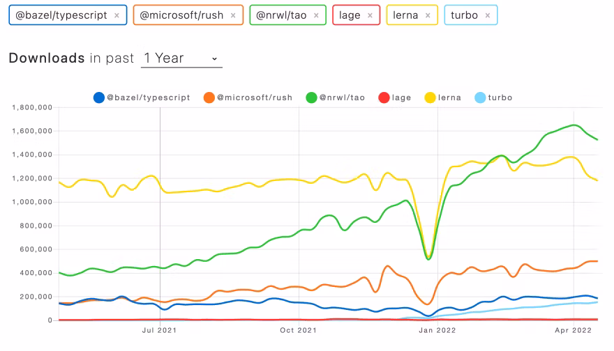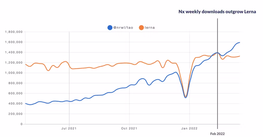 Nx also outgrew Lerna in February in weekly downloads. Up until that point, Lerna was considered the go-to choice when it comes to JS-based monorepos. But just recently, they made it even more evident that Lerna has been and is largely unmaintained.