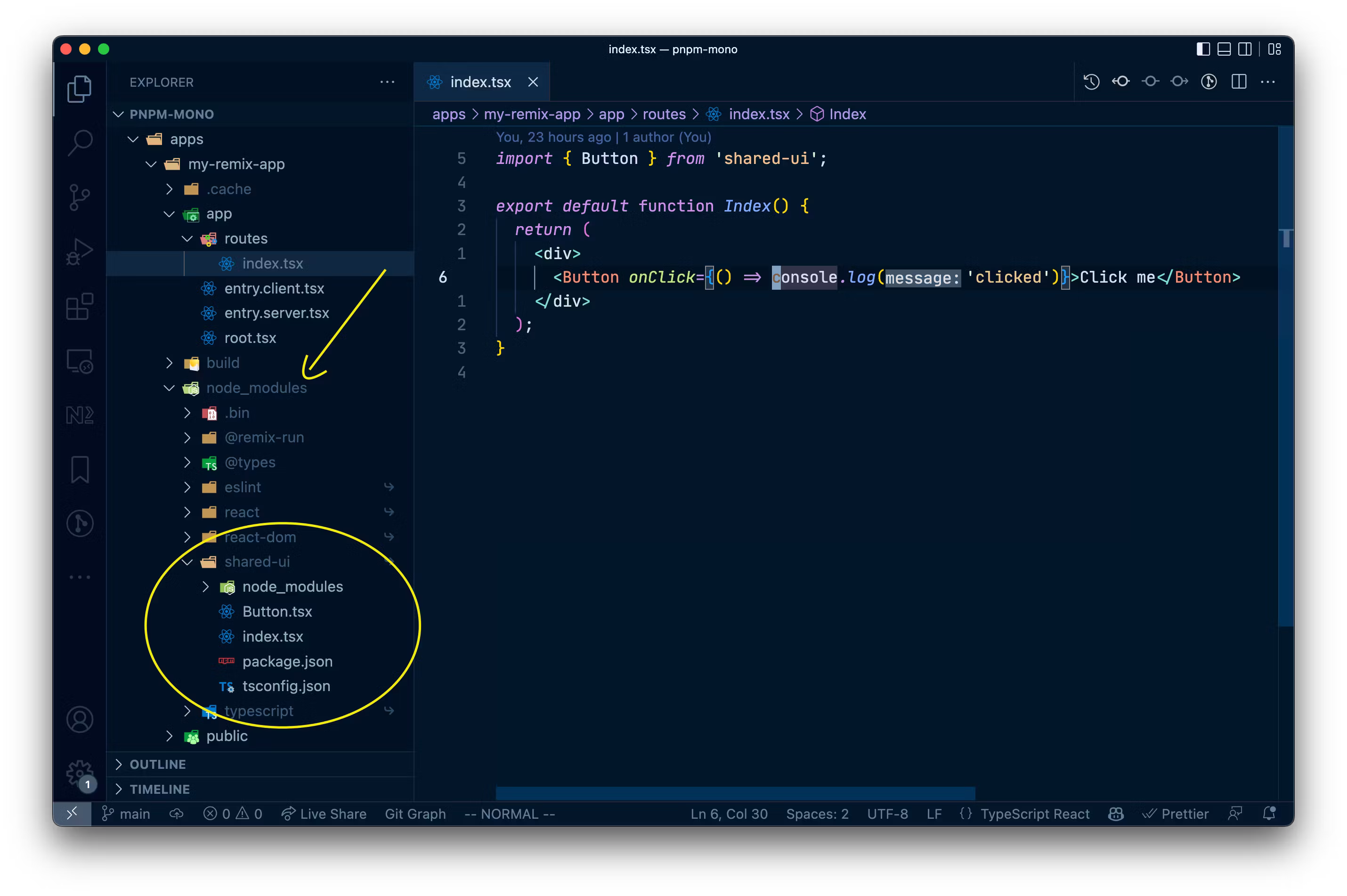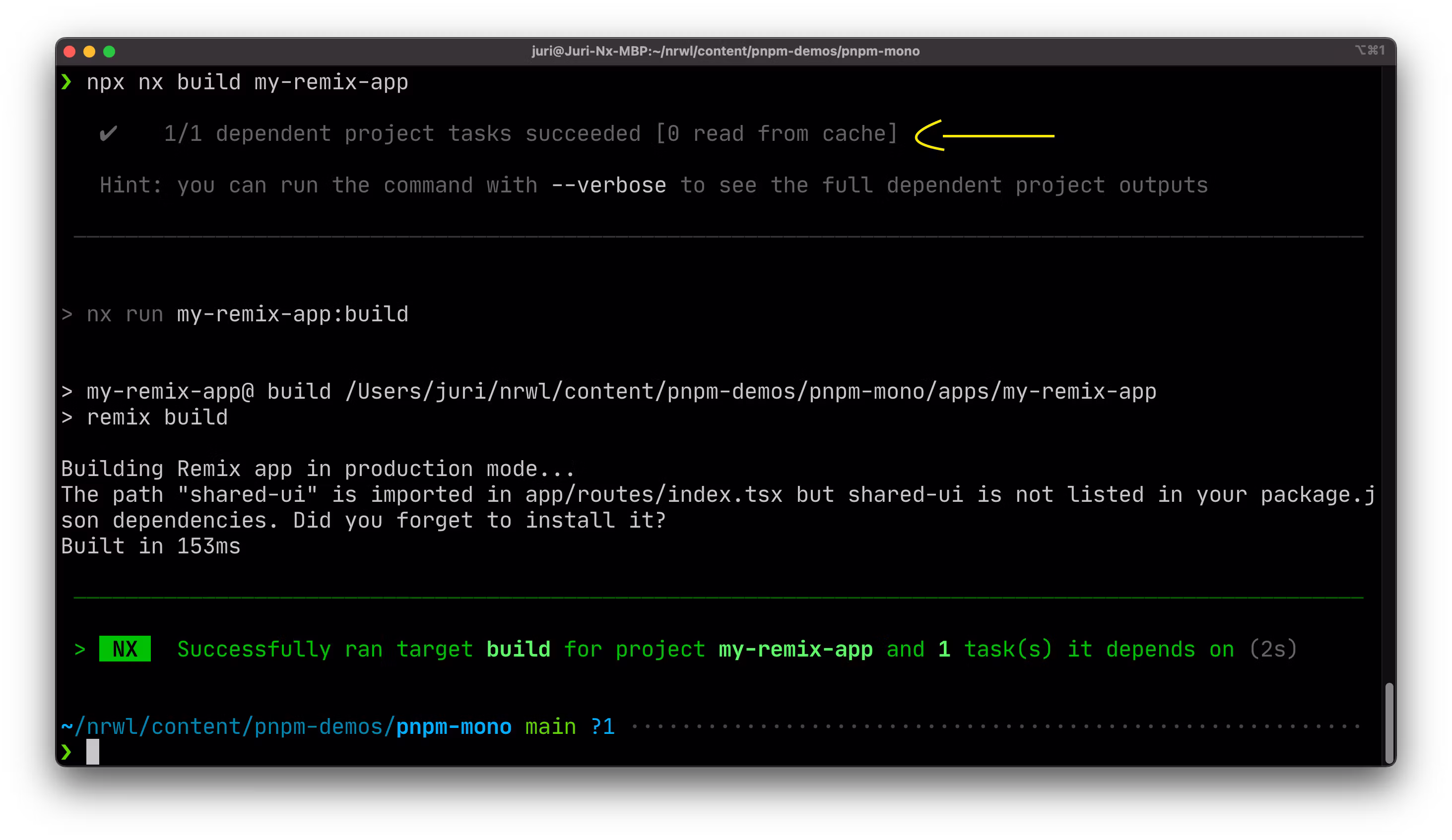 1Error: Cannot find module '/Users/juri/nrwl/content/pnpm-demos/pnpm-mono/apps/my-remix-app/node_modules/shared-ui/dist/index.js'. Please verify that the package.json has a valid "main" entry