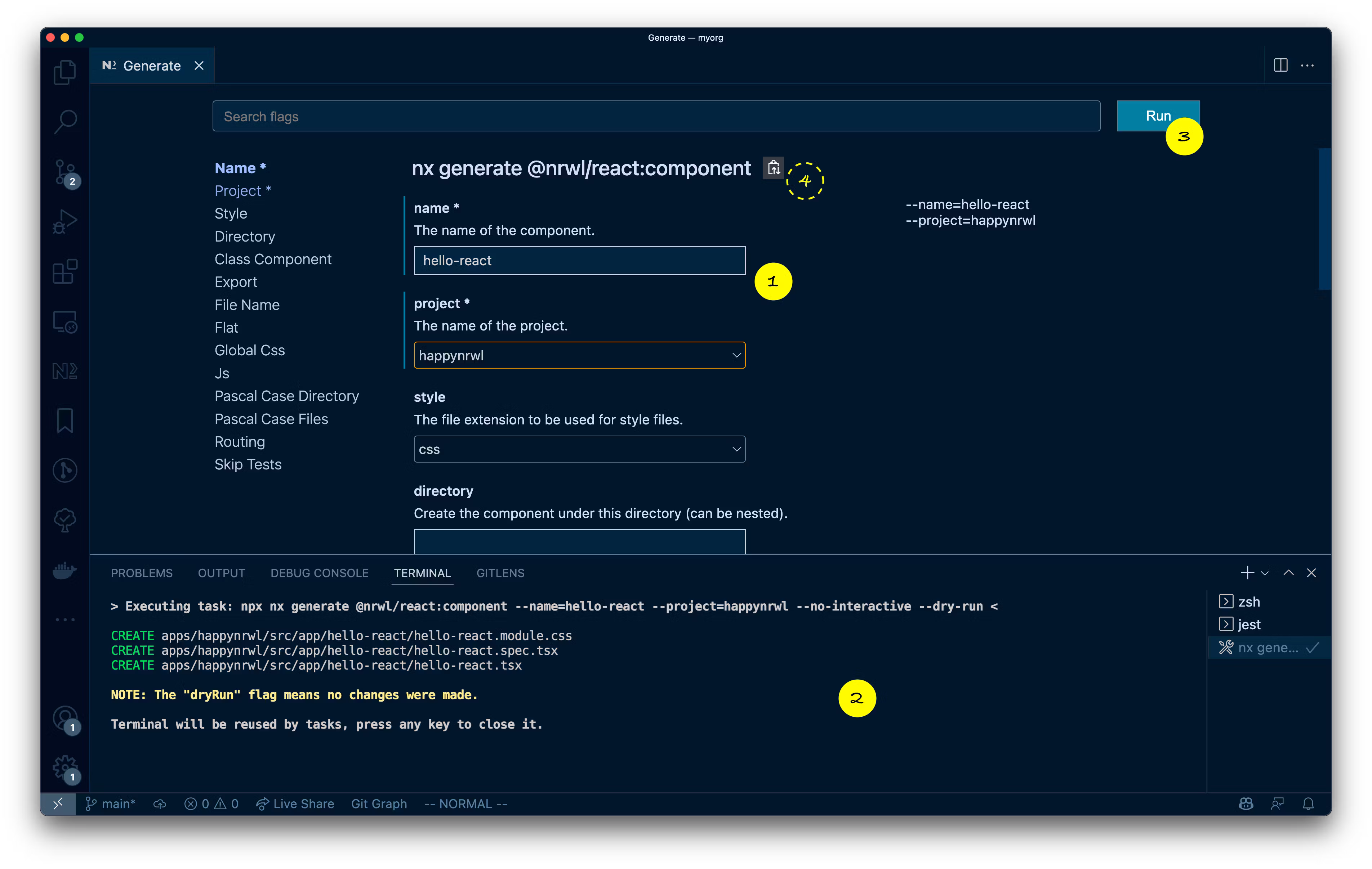 _nx g @nrwl/react..._as a shorthand for_generate_. Also, if you attach_--dry-run_to the end of the command it will just simulate the run without touching the file system.