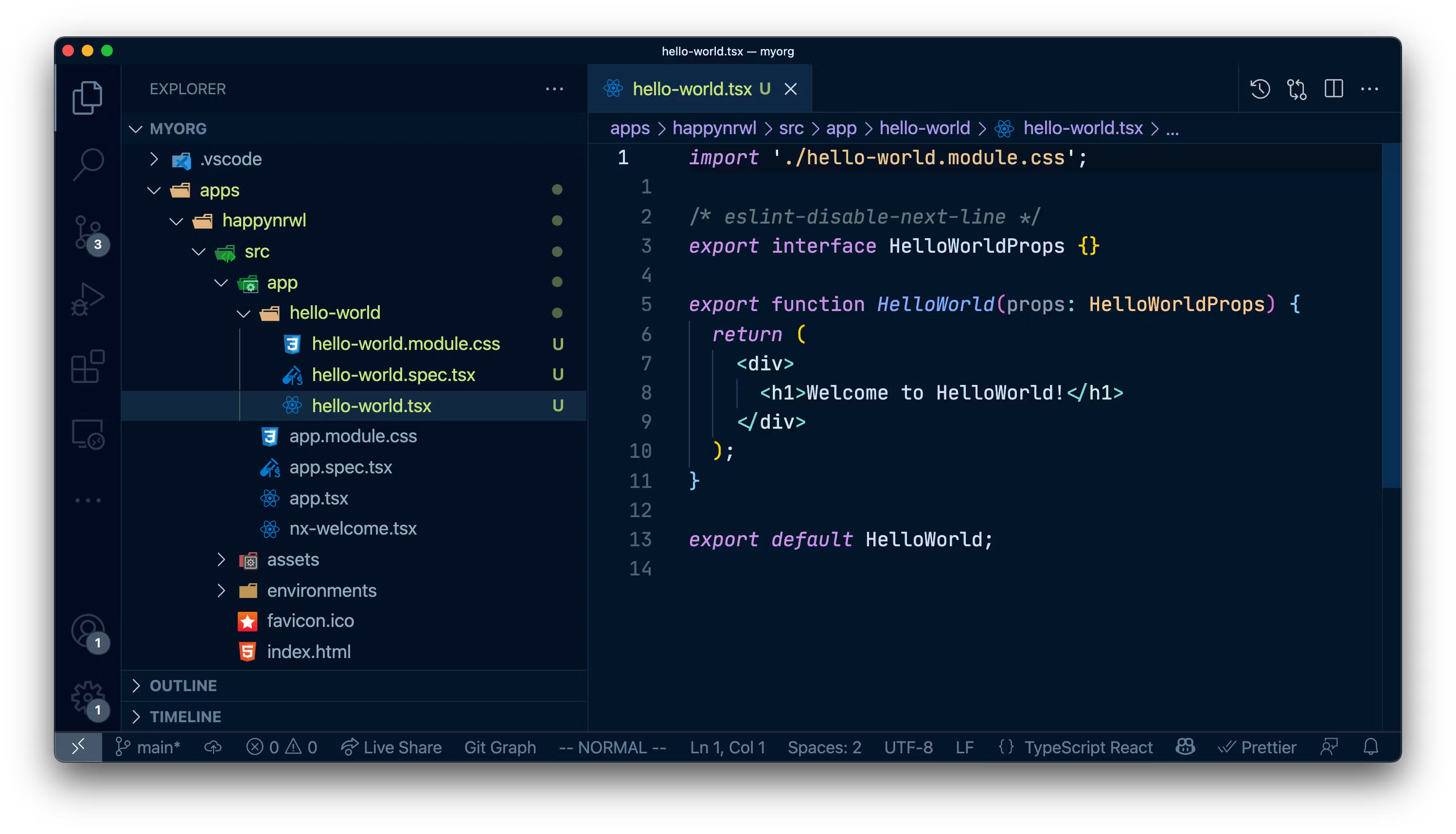 npx nx generate @nrwl/react:component HelloWorld